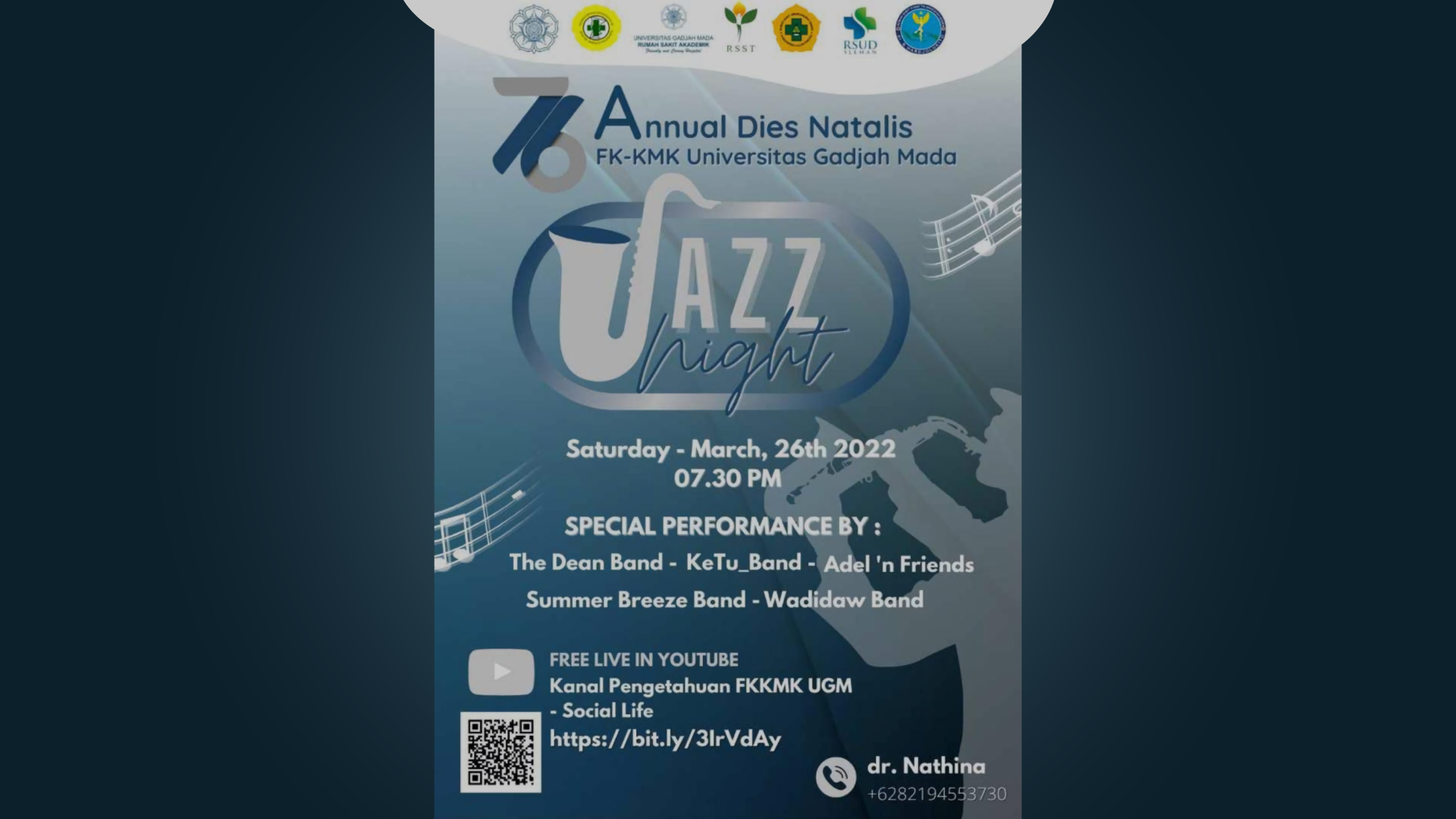 The 13th Jazz Night 2021 kembali hadir untuk menyemarakkan Dies Natalis FK-KMK UGM ke-75, RSUP Dr. Sardjito ke-39, RSUP Dr. Soeradji Tirtonegoro ke-93, dan RS Akademik UGM ke-9 dengan mengusung tema “A Journey from the Past (50-90s Hits): A Concert from Home”.
